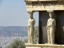Secondo l'architetto romano Vitruvio, che ne parla già all'inizio del primo libro del suo "De Architectura", il nome Cariatide (karyàtis) significherebbe "donna di Karya": le donne di quella città del Peloponneso sarebbero infatti state rese schiave, pur mantenendo le loro vesti e attributi matronali, dopo la sconfitta e la distruzione della loro patria, come punizione per l'appoggio fornito ai Persiani. In seguito gli architetti greci le avrebbero raffigurate come sorreggenti il peso dell'edificio per tramandare il ricordo dell'evento. La spiegazione di Vitruvio va tuttavia correlata con antecedenti le guerre tra Greci e Persiani che si svolsero all'inizio del V secolo a.C.: le cariatidi erano fanciulle danzanti di quella città famosa per i cori annuali. L'architettura greca le aveva raffigurate già nel secolo precedente (tesoro dei Sifni nel santuario di Apollo a Delfi). Le stesse celeberrime cariatidi dell'Eretteo, sull'Acropoli di Atene, a cui probabilmente Vitruvio aveva pensato, non sembrano tradire la fatica derivante dal reggere il peso ma sembrano piuttosto rappresentare delle imperturbabili giovani donne