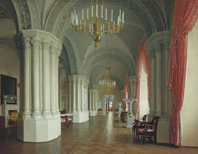 Tuttavia, la più famosa e sfarzosa è la Sala di Malachite, progettata da Alexander Brjullov nel 1837, dopo il terribile incendio che devastò il palazzo. Colonne in malachite verde, porte dorate, capitelli, un soffitto riccamente fregiato, pesanti tendaggi rossi ed enormi specchi simboleggiano lo splendore e la magnificenza degli zar.