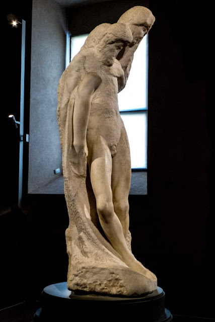È una scultura alta un metro e novantacinque, fatta di quel marmo che Michelangelo sceglieva accuratamente nelle Alpi Apuane, isolata nella sala in cui è esposta così da essere visibile da ogni punto di vista.